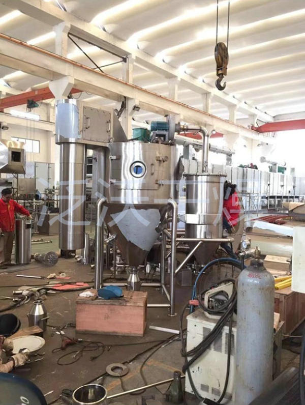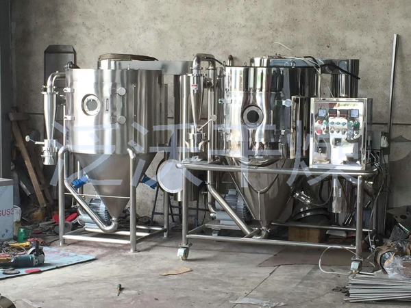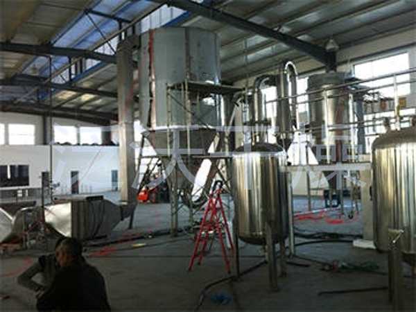 空气经过滤和加热,进入干燥器顶部空气分配器,热空气呈螺旋状均匀地进入干燥室。料液经塔体顶部的高速离心雾化器,(旋转)喷雾成极细微的雾状液珠,与热空气并流接触在极短的时间内可干燥为成品。成品连续地由干燥塔底部和旋风分离器中输出,废气由风机排空。