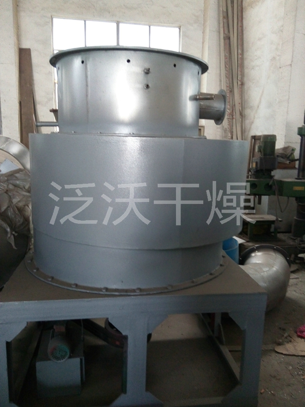 热空气由入口管以适宜的喷动速度从干燥机底部进入搅拌粉碎干燥室,对物料产生强烈的剪切、吹浮、旋转作用,于是物料受到离心、剪切、碰撞、摩擦而被除数微粒化,强化了传质传热。在干燥机底部,较大较湿的颗粒团在搅拌器的作用下被机械破碎,湿含量较低、颗粒度较小的颗粒被旋转气流夹带上升,在上升过程中进一步干燥。由于气固两相作旋转流动,固相惯性大于气相,固气两相间的相对速度较大,强化两相间的传质传热,所以该机生产强度高。